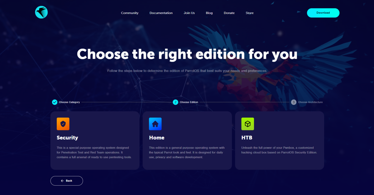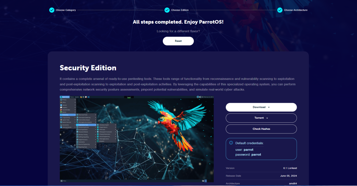 今回はペンテスト・CTF に使用する予定なので,Security バージョンをダウンロードします. HackTheBox で使用する場合は HTB でも大丈夫です.