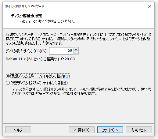 Linux Debian 12.x (64bit)を選択し VM 名を決定 ディスクサイズは 60GB に設定します.