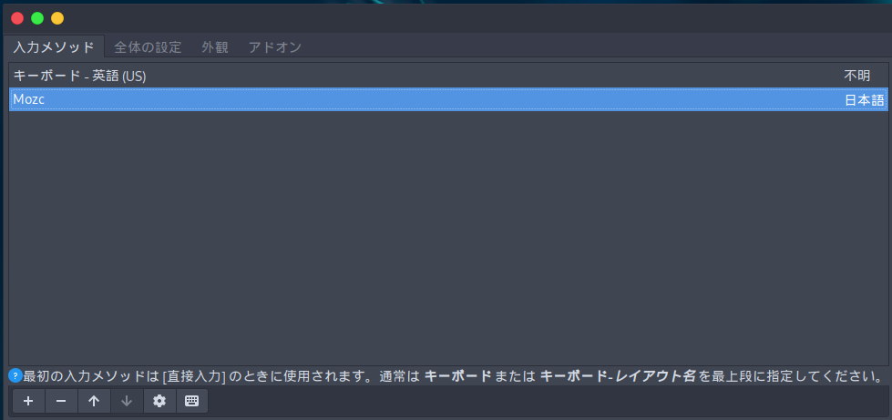 私は英字キーボードで日本語入力を行いたいため,Generic 101 key の英語と mozc を設定しています.