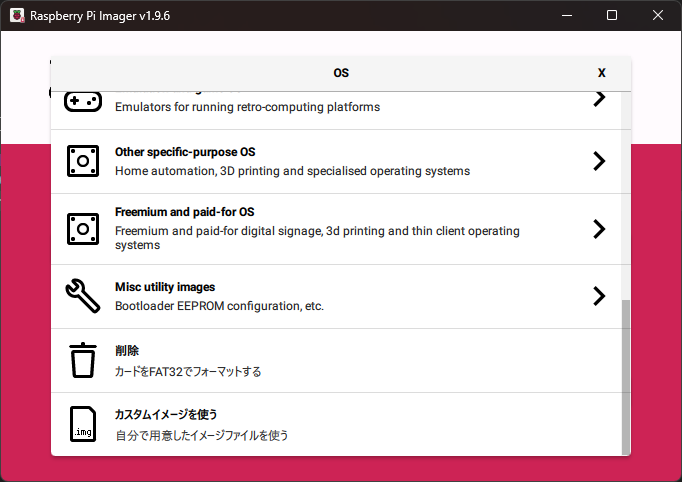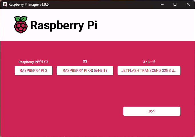 フォーマットが完了したら,使用したいラズベリーパイのバージョンを選択し,OS を選択してから次へを選択します.