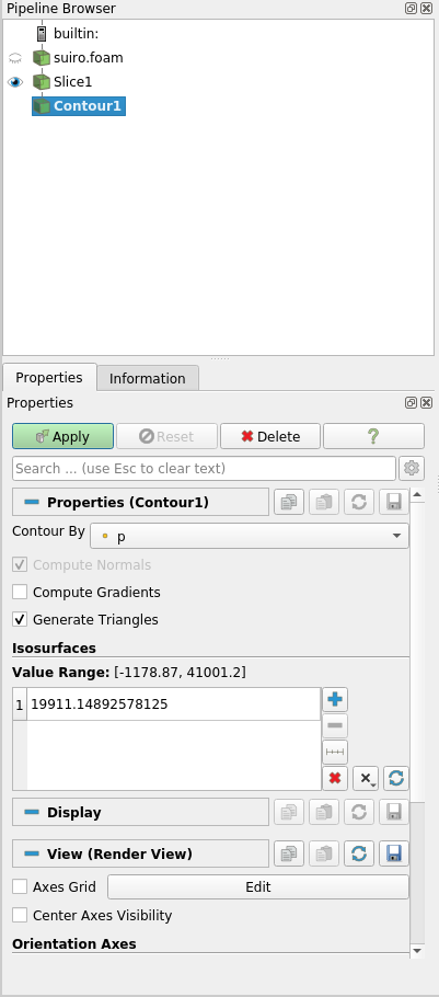 今回は,alpha.Water の境界面を表示したいので,ContourBy に alpha.Water を設定し,isosurfaces に 0.5 と入力し等値面を生成します.